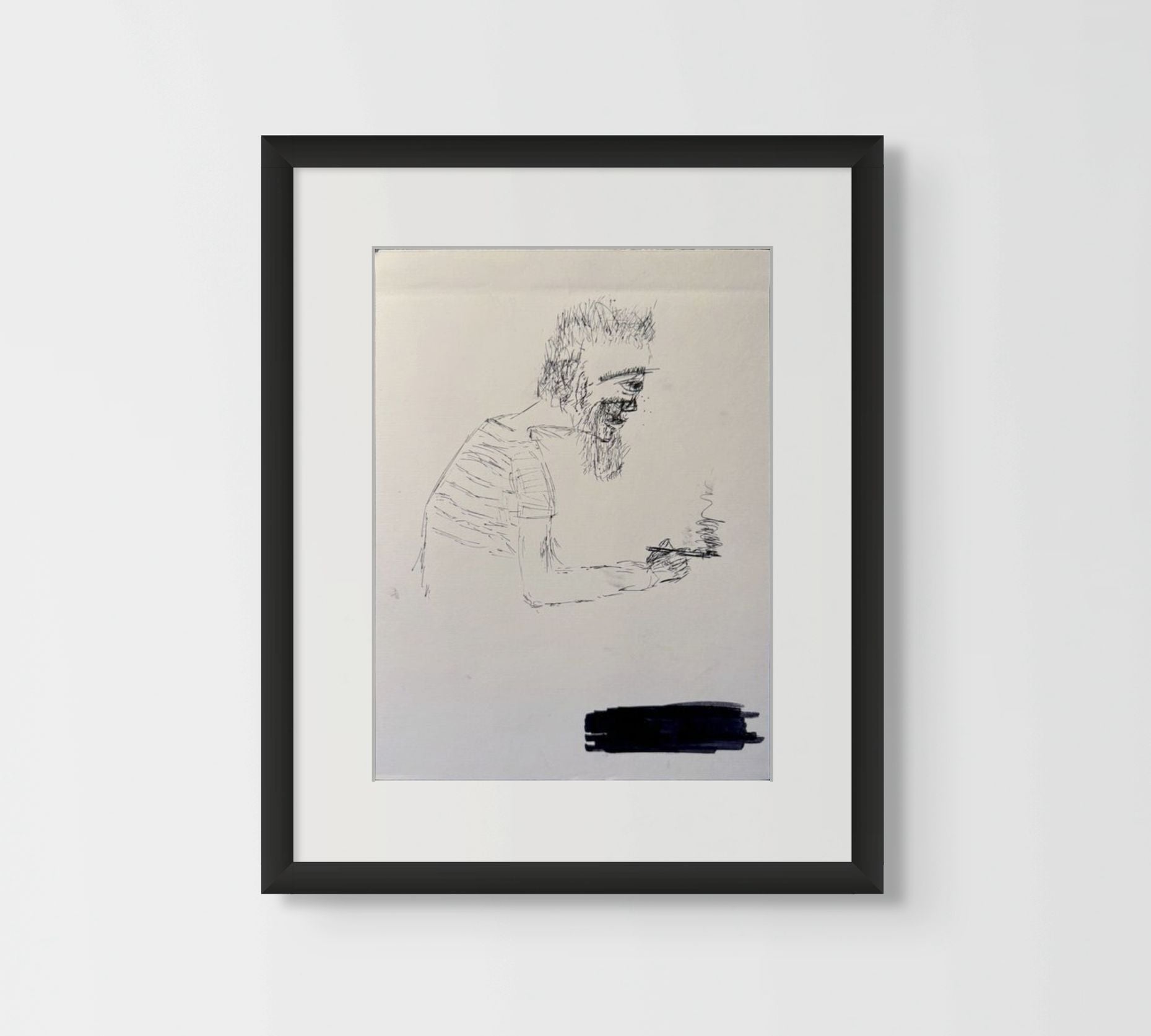 A quiet, unguarded moment rendered in sharp lines and subtle contour. The figure, captured in profile, wears a striped shirt that draws the eye toward the center of the composition. Its ambiguity – neither posed nor explained – gives the piece a stillness that invites projection and interpretation.