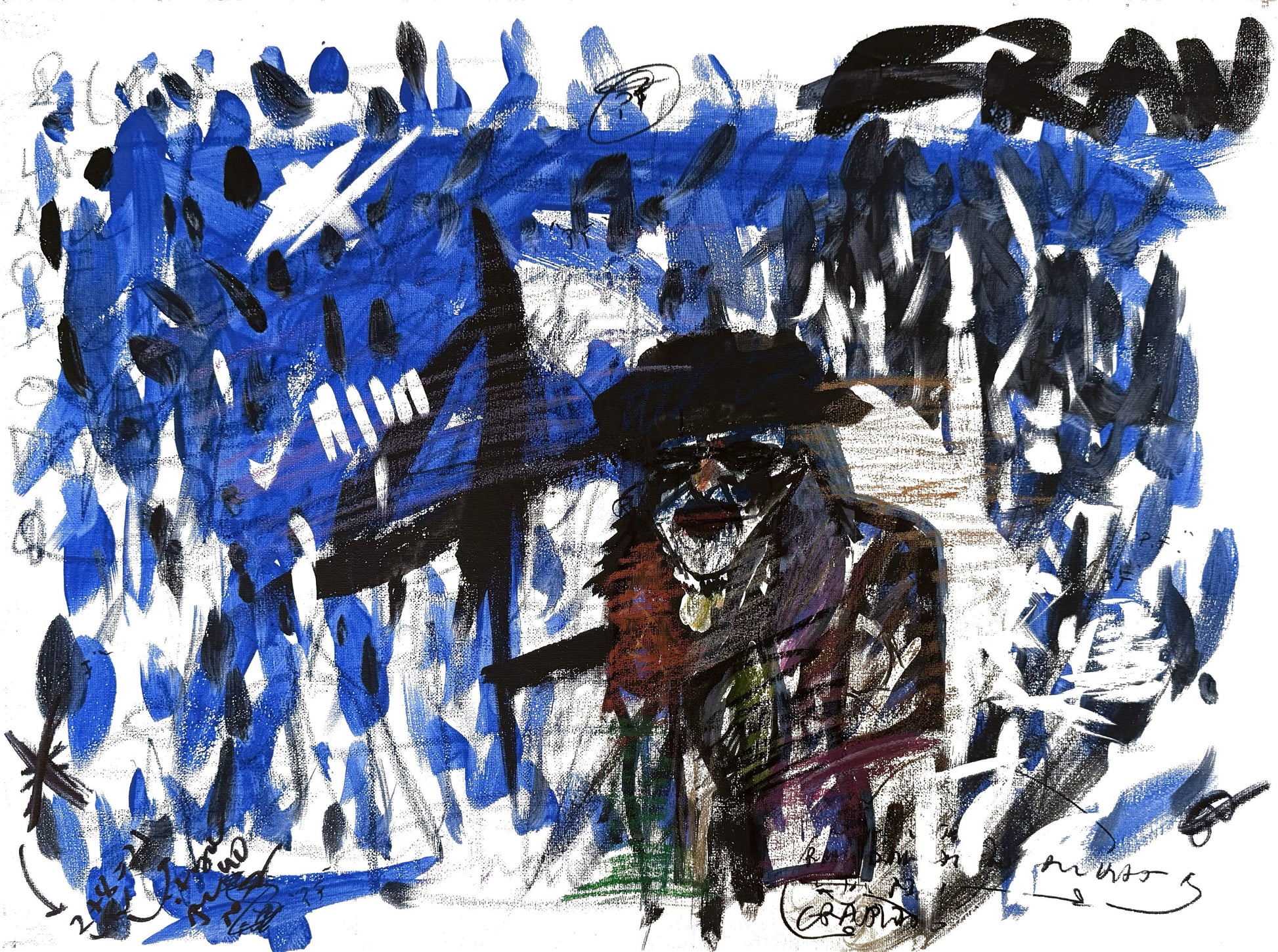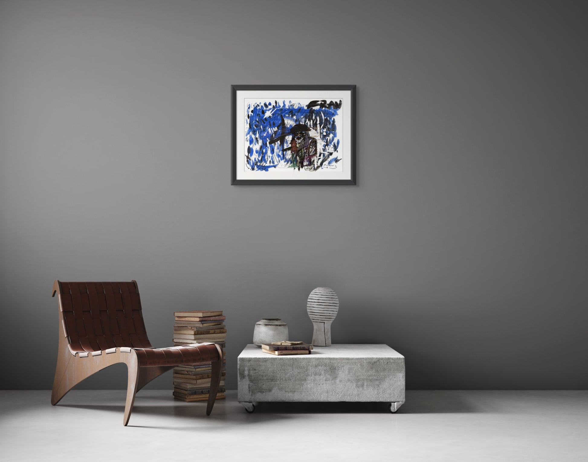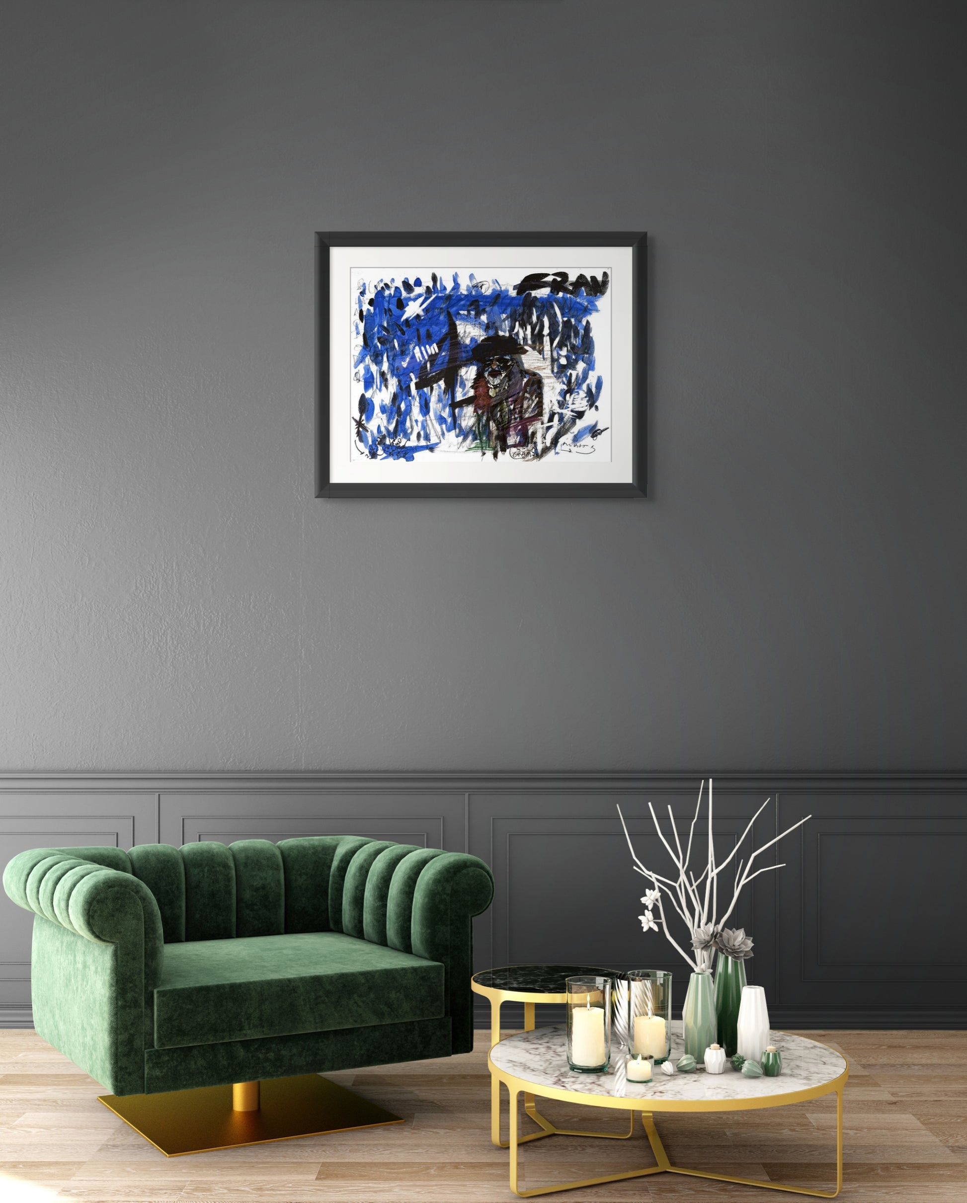 Man in the Rain with an Umbrella captures the quiet tension between vulnerability and shelter. The figure, loosely defined, is framed against a cascade of rain rendered in layered strokes of gray, blue, and muted white. The umbrella is both a shield and a symbol, anchoring the composition while the surrounding atmosphere dissolves into movement.