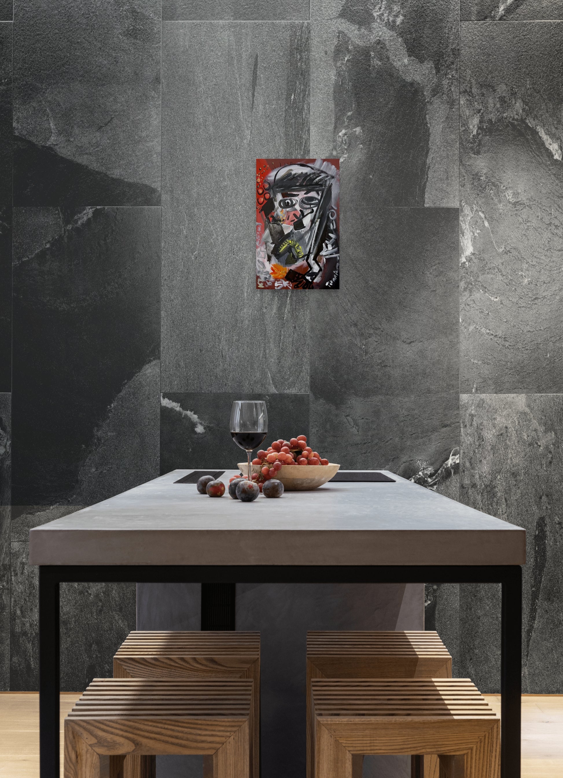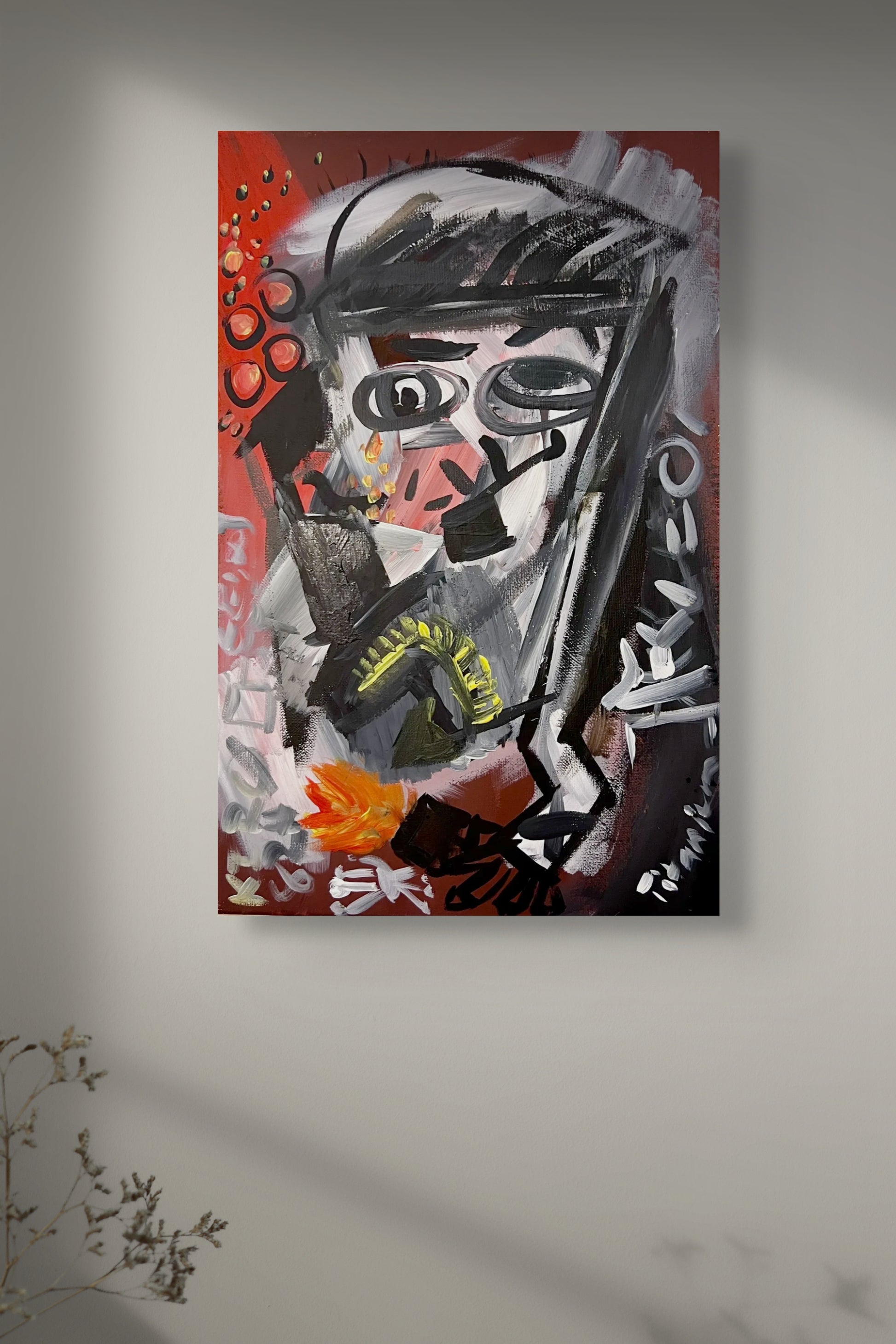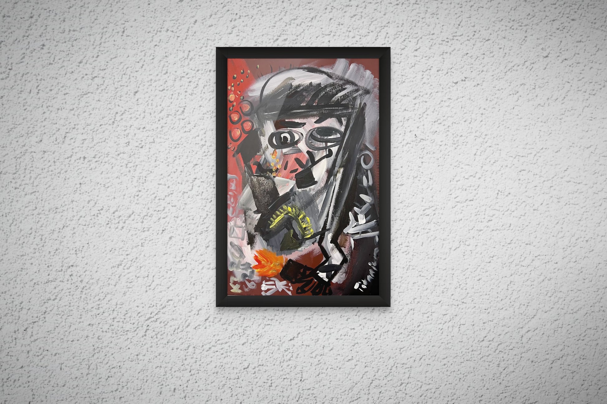 “Sad Man Smoking a Pipe” is a compact yet charged work that navigates the threshold between figuration and abstraction. Executed entirely by hand, the composition is dominated by reds – a chromatic field evoking heat, restlessness, and inward fire. Within this intensity, the faint suggestion of a figure emerges: a solitary man, absorbed in the ritual of smoking, his presence more spectral than literal.